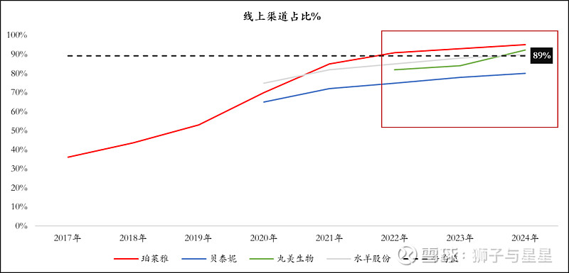 2024年对标公司线上渠道占收入比重均值89%,除了贝泰妮低于均值,其他品牌线上渠道占比都超过90%