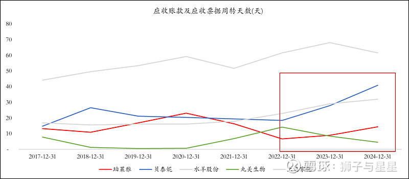 第一篇文章已经看到公司被线上渠道“卡脖子”导致收入回款被拖累。一起看看行业里应收款周转天数,近3年除了丸美生物,头部2家账期趋势都在变长