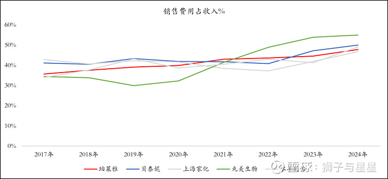 a) 销售费用占收入%,各公司多差不多,2024年基本集中在40%,又是丸美生物异军突起干到54%(还记前面前提到的吗,只有丸美生物收入逆势增长)
