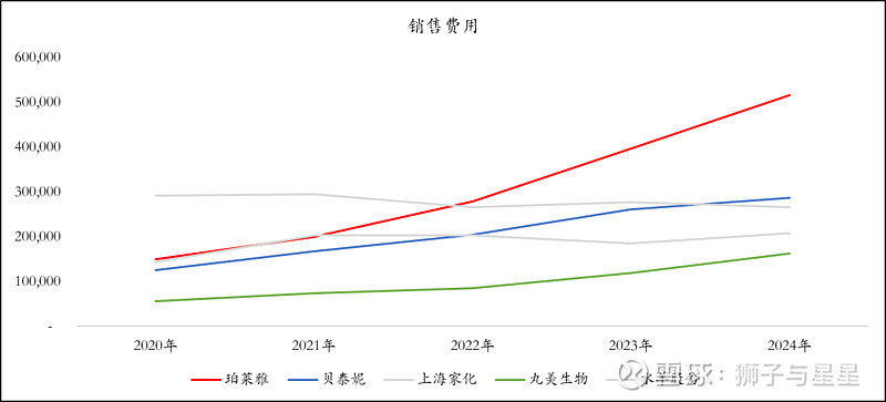 b) 销售费用占收入比例趋同,但珀莱雅收入最大,所以其销售费用绝对值也是最多的,独占鳌头