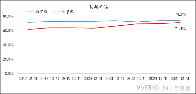 -毛利率,虽然公司低于欧莱雅,但是双线聚拢,已经无限接近,只差3%