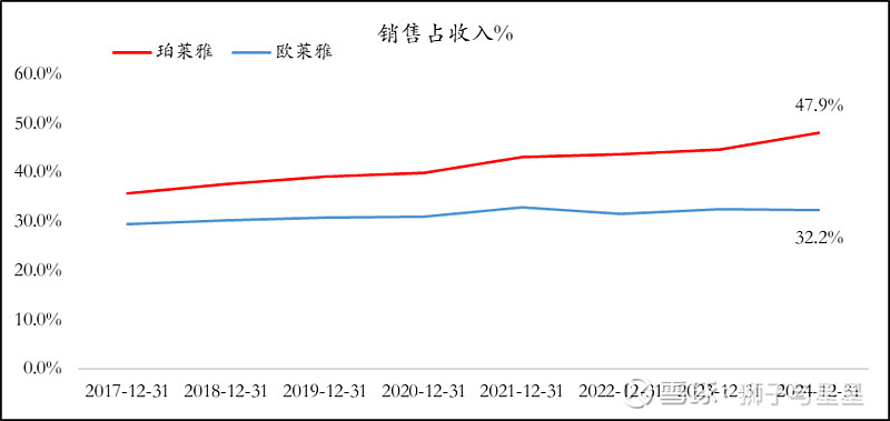 -销售费用占比,双线开口,珀莱雅高出15%(绝对值没法比,销售费用欧莱雅1000亿/年,珀莱雅50亿/年)