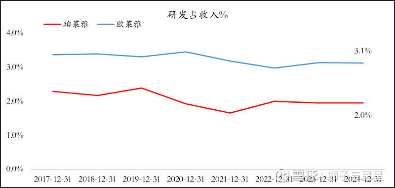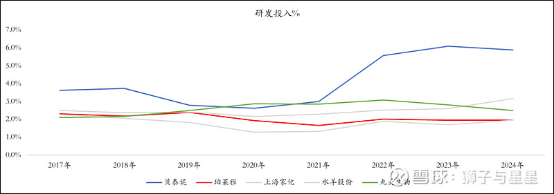 a) 研发投入占收入%,除了贝泰妮高达6%,其他各公司差不多,2024年基本集中在2%-3%;跟销售费用占比40%-50%相比,研发投入占收入比很低