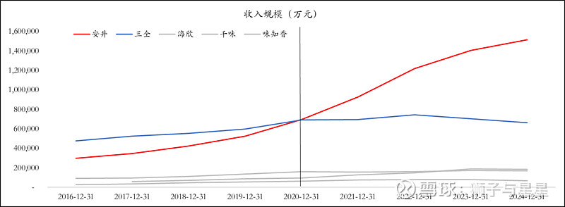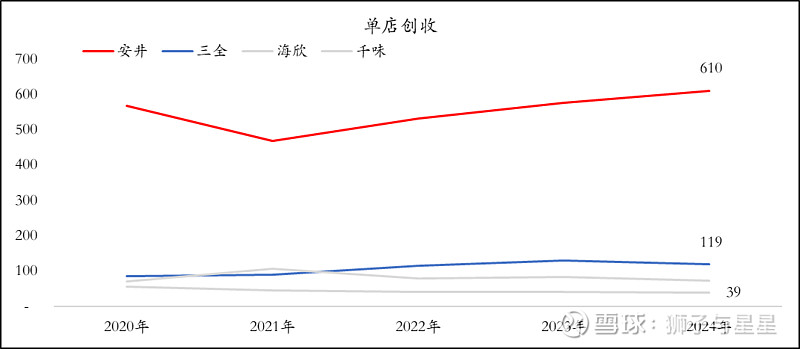 图1,2020年之前三全才是老大,2021年开始三全增长停滞,安井超过三全,之后差距越拉越大,2024年安井收入150亿,是三全的2倍