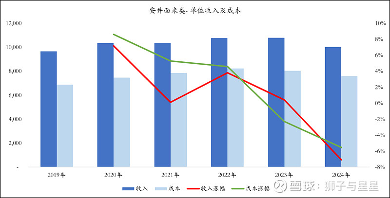 我把安井食品年报里分产品的成本数据进行处理后,得出每个类别单位收入及单位成本(元/吨),然后画出第二张图,各位领导看出门道了吗?