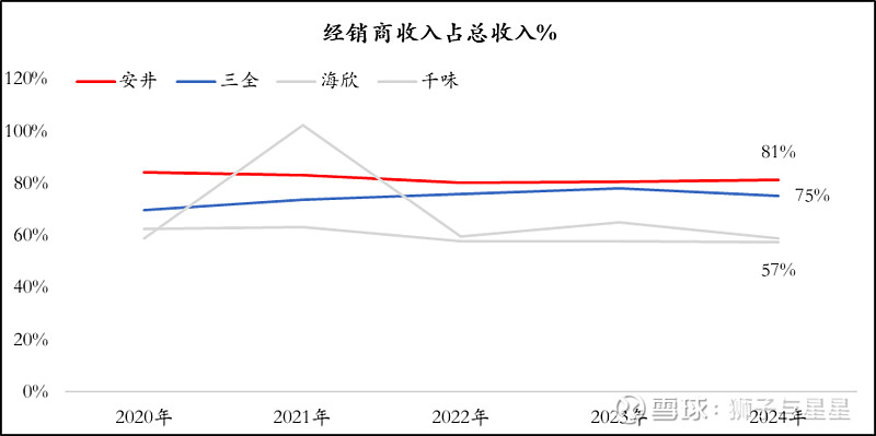 (3)海欣食品,对比2个龙头,渠道相对更多元,但经销商仍超过一半