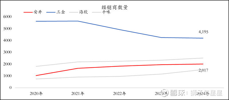 图2,经销商数量对标,三全食品断档领先,近4200家规模,其他三家基本集中在2000家这个区间。而且三全4200家,还是经过2021-2023年3年下降后的数字