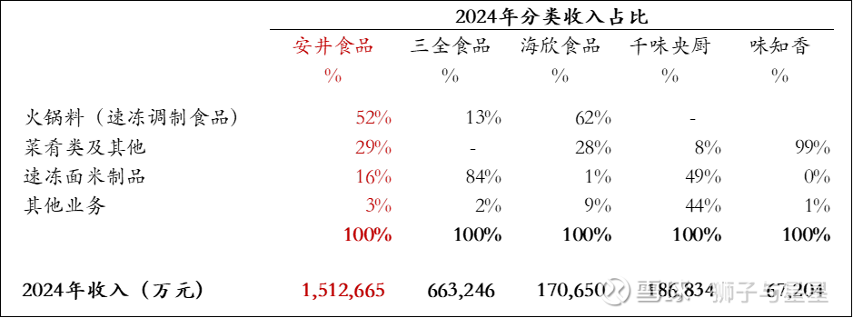 每一家产品侧重点都不太一样,后面对标的时候,将以安井为基准,主要跟三全对比,再加入相对可比的公司进行分析