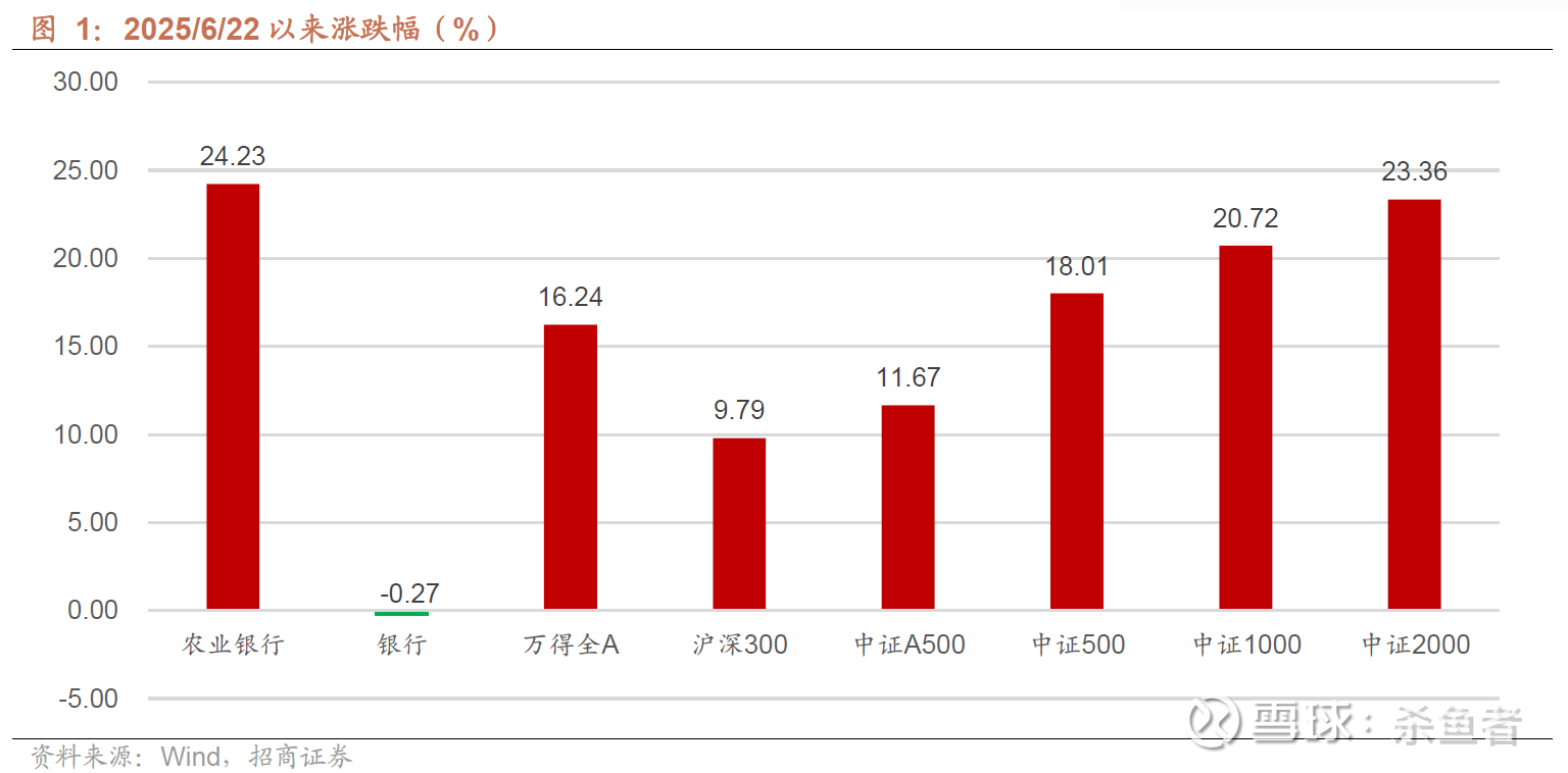 从行情来说,6月22日至今,Wind全A也上涨了16.24%,中证1000、证2000分别上涨了20.72%、23.36%(图1),所以相对于全市场而言,农业银行A股不算超额上涨。