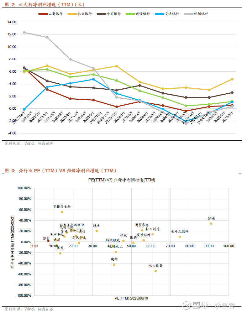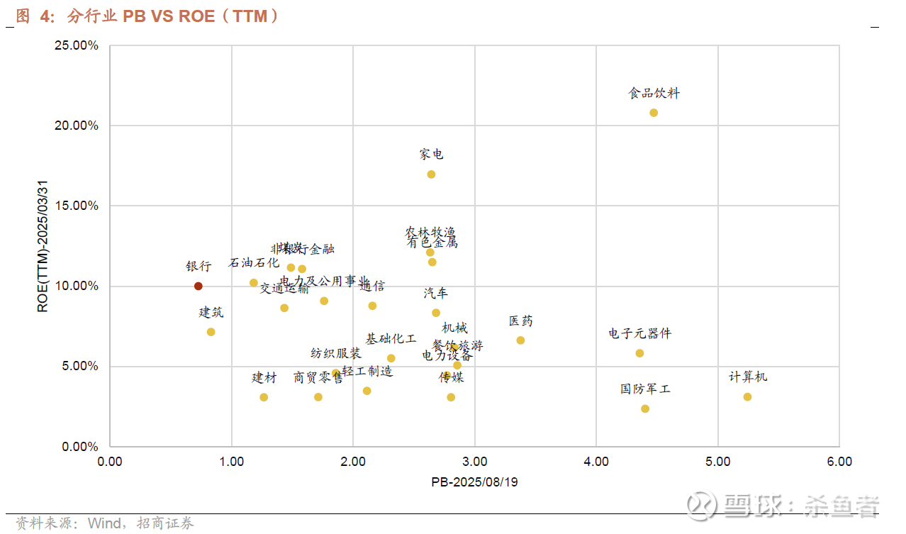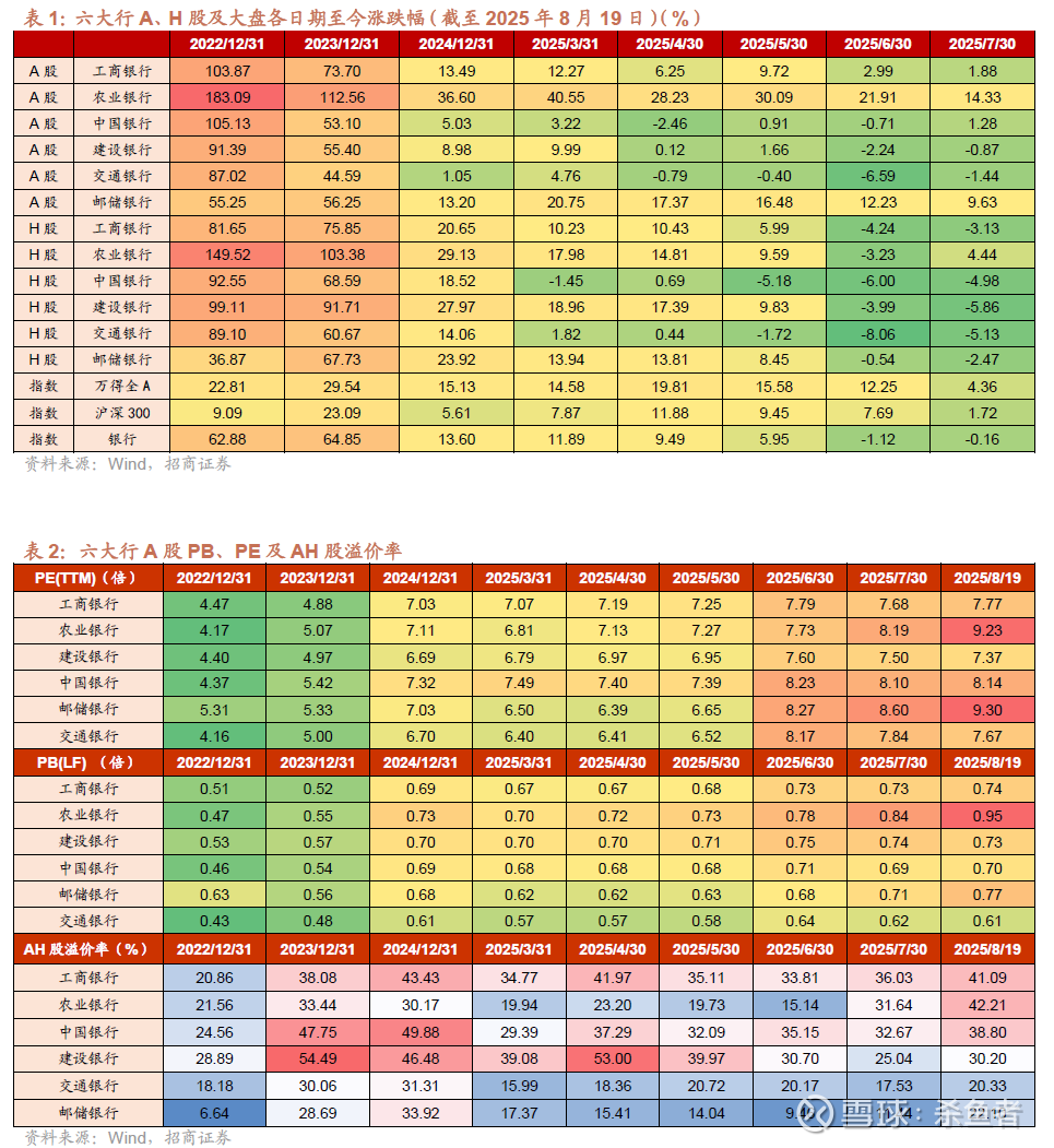 从当前估值来看,截至2025/8/19收盘,Wind全A的PB为1.8倍,PE为21倍,银行板块PB为0.7倍,PE为7倍。盈利能力方面,Wind全A最新ROE(TTM)(PB/PE)约8.3%,银行ROE(TTM)约10.0%。从投资角度,更高的ROE值得更高的PB,优质银行值得估值溢价,历史上不少银行PB都曾超过1倍,目前招商银行凭借优质的基本面,PB估值回到了1倍以上。