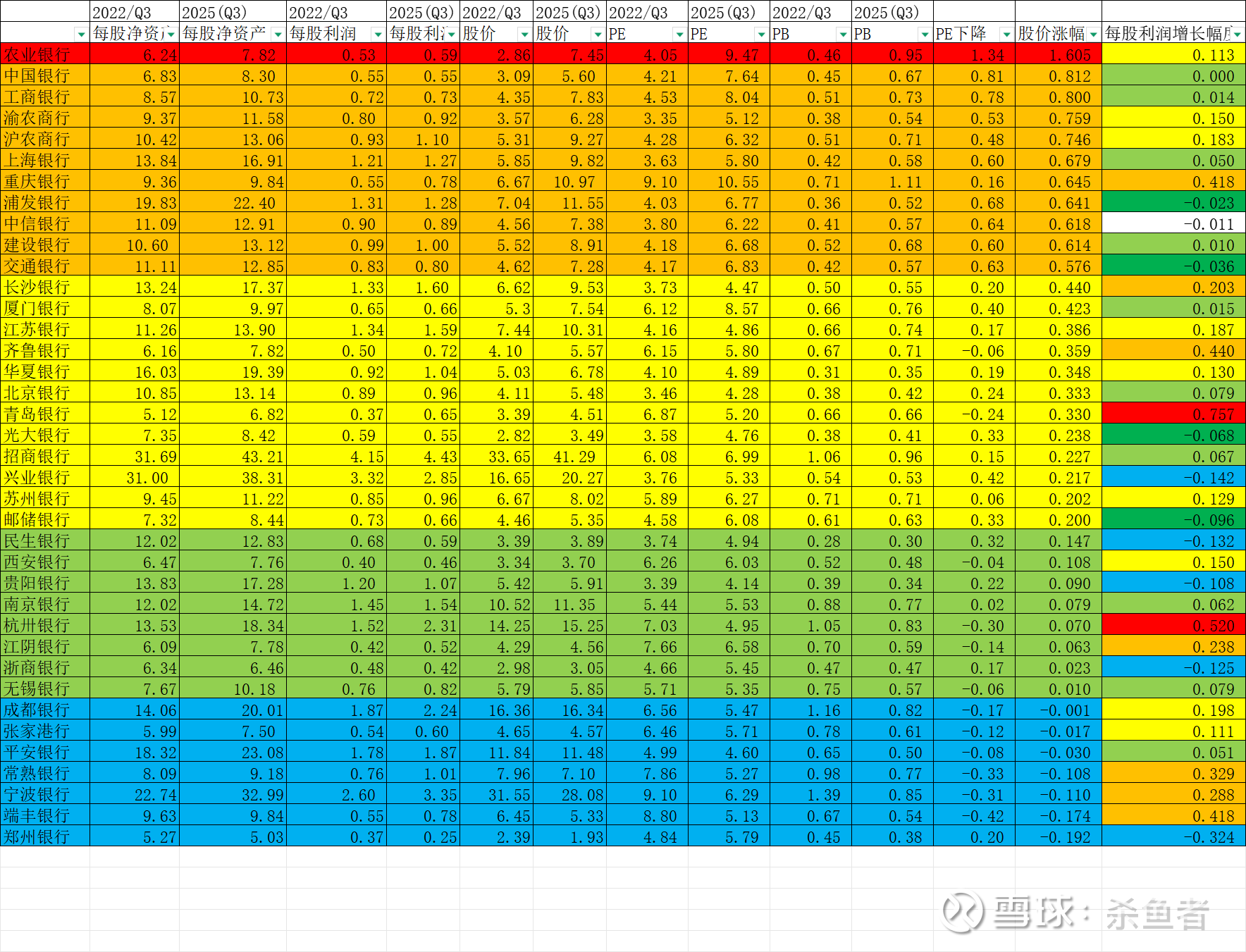 近三年绝大多数机构和股民均认为银行股走了三年大牛趋势,能去真正分析再做结论非常少,我们先看下表三年(2022/Q3∽2025/Q4)各银行股涨幅,每股利润增幅和PE下降幅度