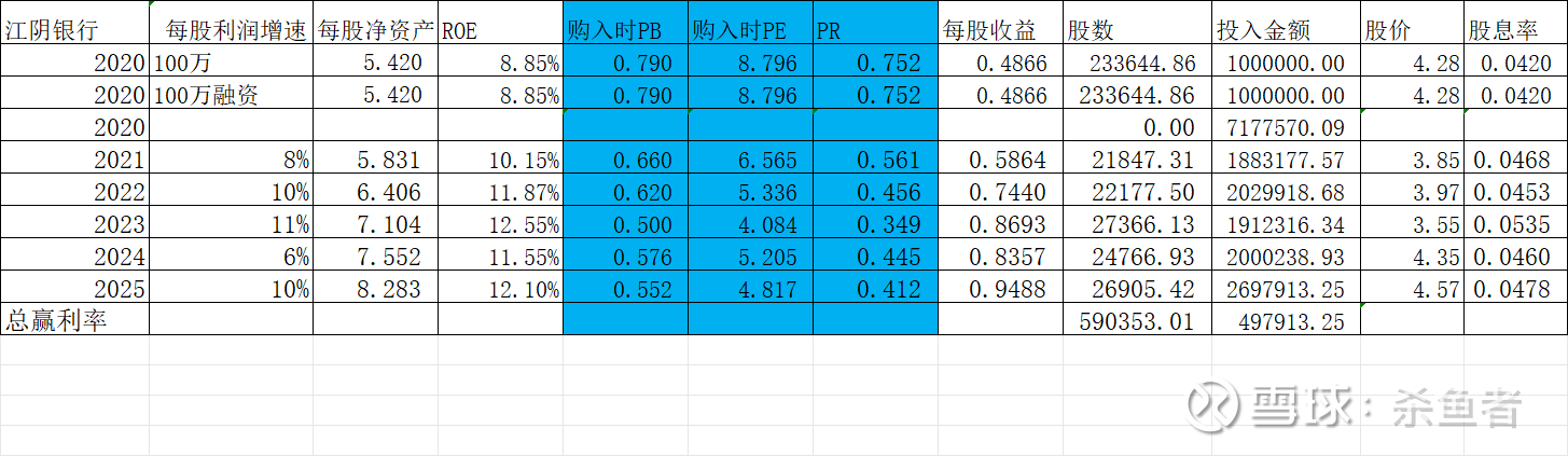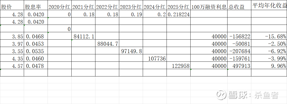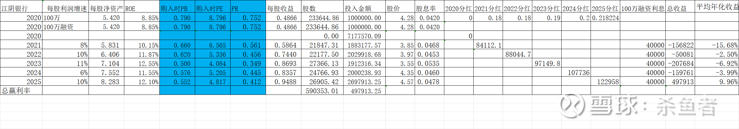 我们再来看一下江阴银行这五年具体情况(假设2020年买入100万并融资100万,且融资利息4%),分红再投入