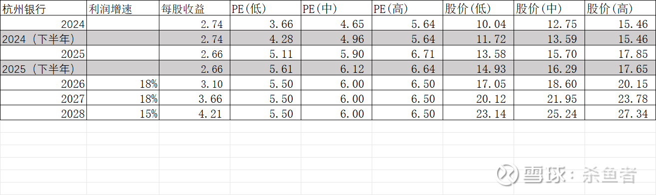 2024年年初的优质城商行极端低估是非正常状况,故我以2024/2025年下年的杭卅银行估值(股价)区间变化,估值(股价)分为低/中/高