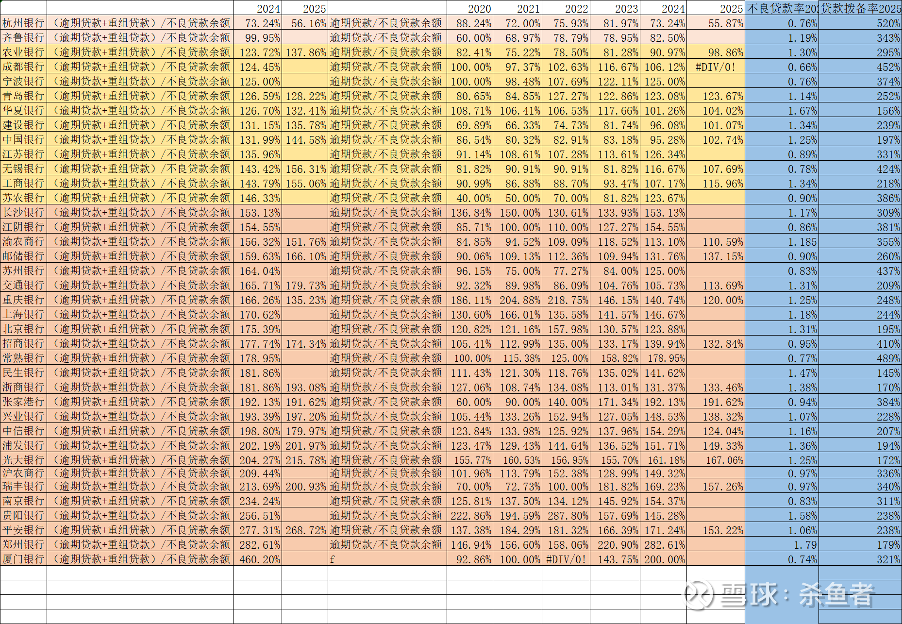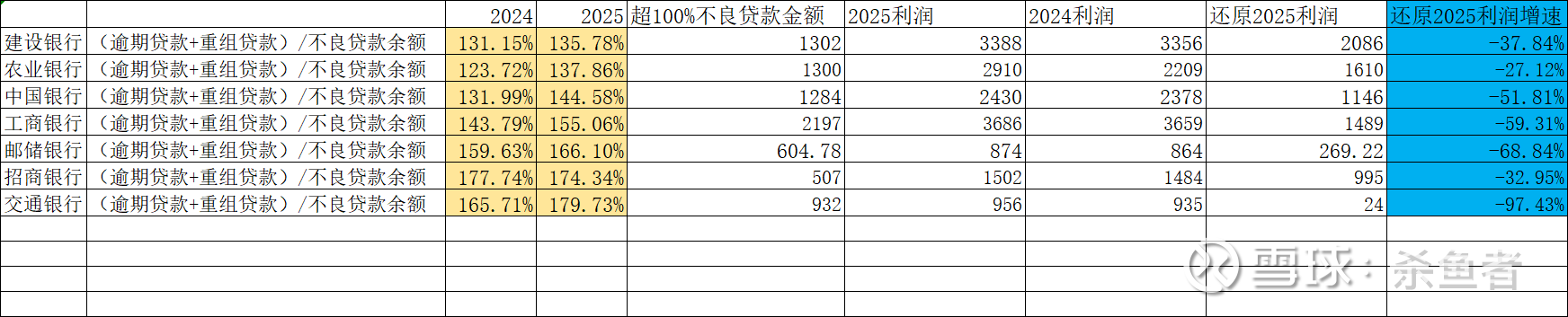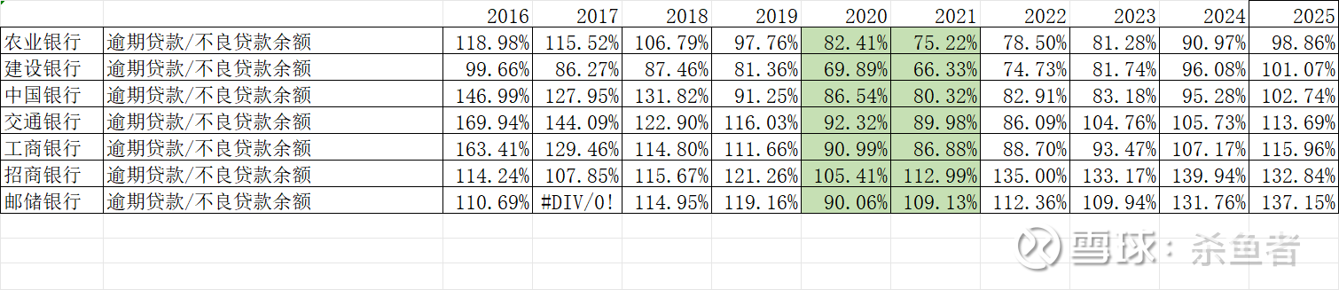 从下表看大行(逾期贷款/不良贷款余额)贷款偏离度看,2025年农业银行不良认定最严(仍然<100%),招行/邮储贷款偏离度变坏趋势较大