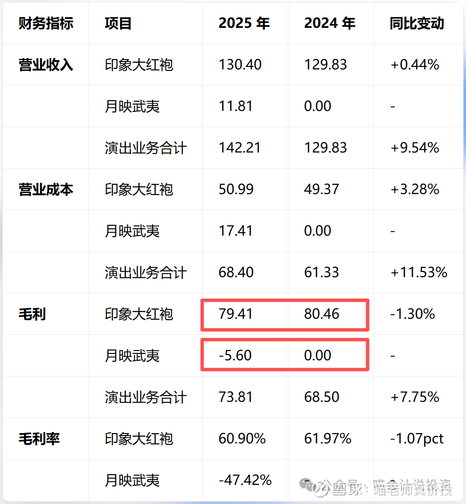 公司的年报披露比较晦涩,喵老师手工把《印象·大红袍》和《月映武夷》拆开就行了。《印象·大红袍》两年的毛利都是8千万的数量级,毛利率始终保持60%+。中流砥柱不倒。
