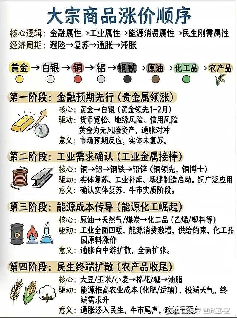 近期可以布局一些农业相关的,$圣农发展(SZ002299)$ $牧原股份(SZ002714)$ 之类的,但是逻辑可能不是下图的逻辑。我个人认可下图中商品的涨价顺序,但是不认为这个可以指导A股投资。因为A股提前量被打的太多了,比如化工现在已经没几个便宜货了,如果买错了或许会被套。同时A股整体作为一个市场,存在很强的联动,昨天晚上有色商品大跌,下周股票下跌大概率会带崩整个市场,这种情况下你买化工还是石油都没用。