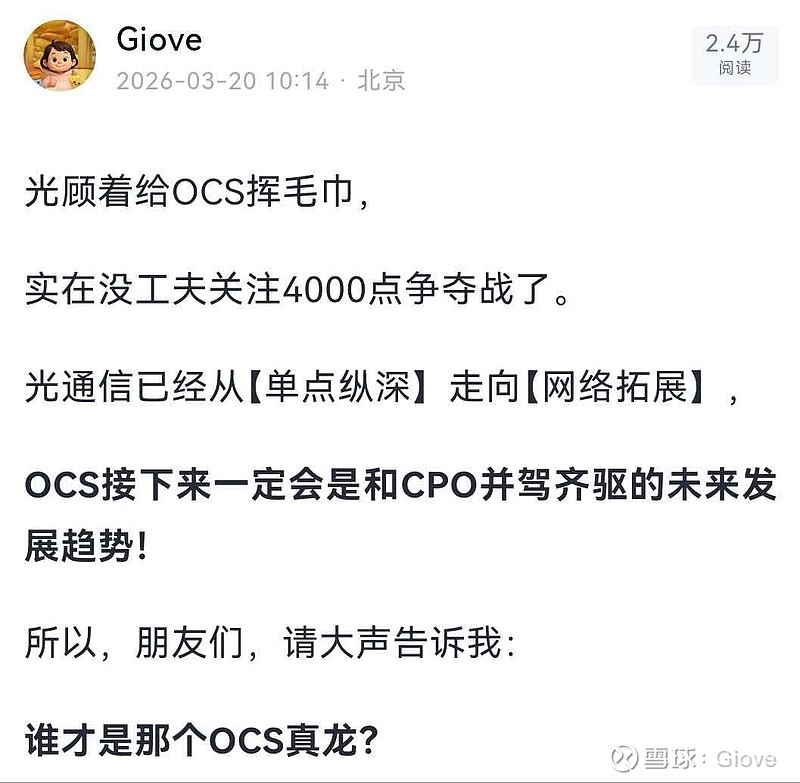 $腾景科技(SH688195)$ OCS真龙现身!还是那句话,光通信目前最大的预期差就在OCS,从单点光模块的速度升级,到整个网络的通信逻辑革命,得是一片多大的星辰大海?CPO都能半个月翻倍,你凭什么不能?就只因为去年已经涨过一轮了?选择在5000股下跌的时候发动,就是为了说明,产业趋势面前,一切都是浮云!另外,弟弟$德科立(SH688205)$ 加油啊,周五被你套住了$上证指数(SH000001)$ 也加油,下面有大量的抄底盘等着进来呢