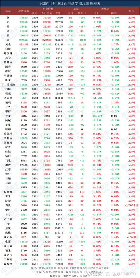 2025年9月10日,百川盈孚统计的600个大宗商品中,其中上涨的商品有79个,占比13.2%,较上一工作日减少42个;下跌的154个,占比25.7%,较上一工作日增加39个;平稳的367个,占比61.1%。