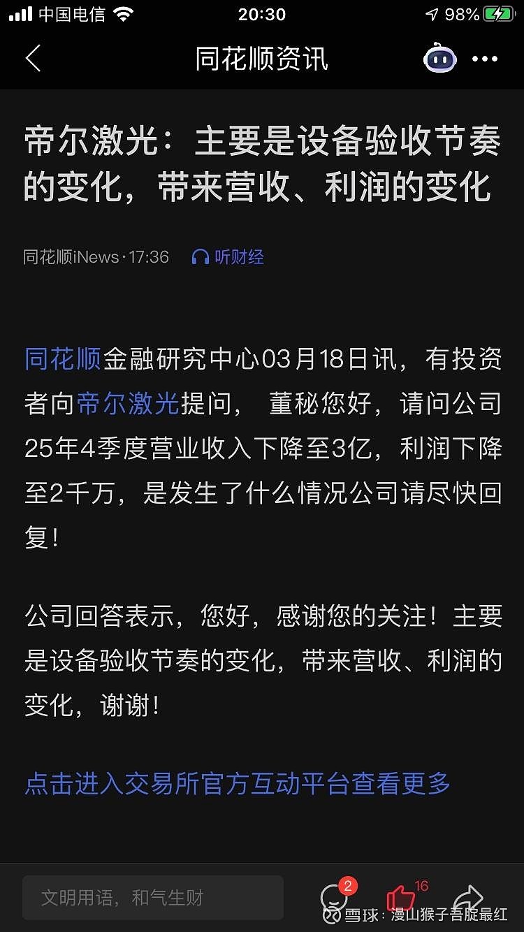 $帝尔激光(SZ300776)$ 今天董秘回答 25 年 4 季度营收大幅下降是因为供货设备验收影响的收入确认,那么叠加年前光伏退税政策引起的各厂过年加班加点大冲产量…2026 年 1 季度的业绩…? 我要验牌!
