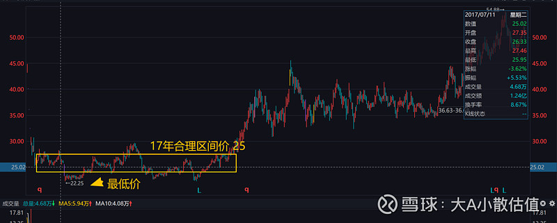 股价 17年合理价区间25,25年合理价区间88(后复权,合理股价指该年时段,比较容易买到或卖出的价格,并非单指股价是否合理估值)