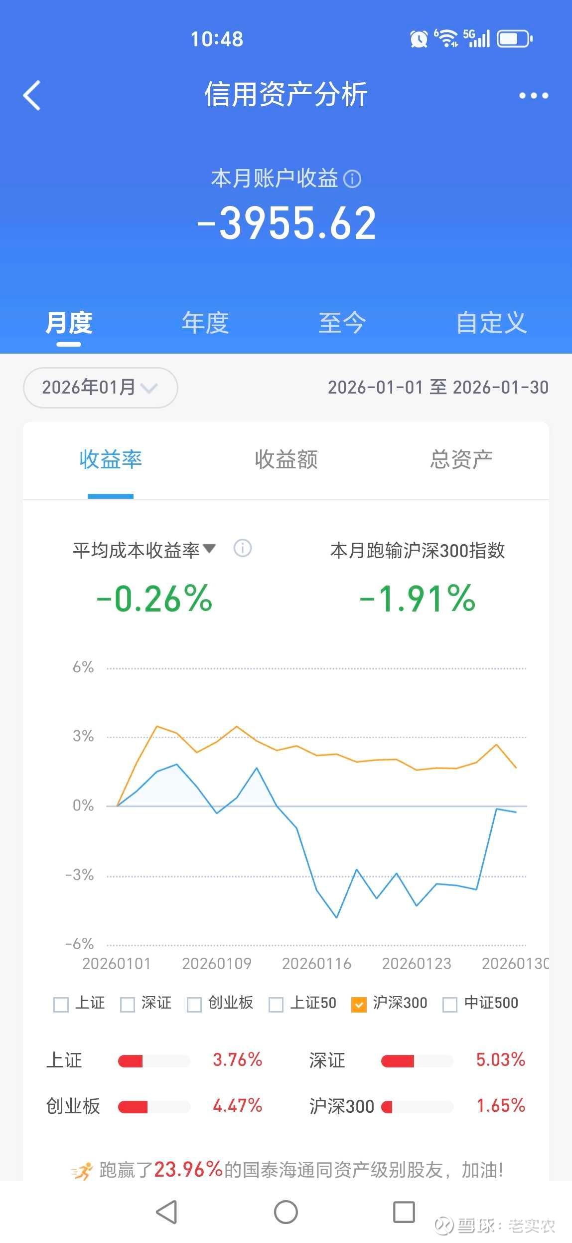 1月持仓股价大部分时间都在下跌,月浮亏-0.4万,年度收益率-0.26%,账户净资产154万元,目前仓位为127%。