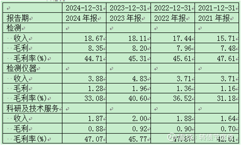 检测收入和监测仪器是占大头的收入,检测收入每年都在增长,利润也很高,感觉公司是垄断了某一个检测业务。看一下评级报告能看出来,是垄断了三个领域。