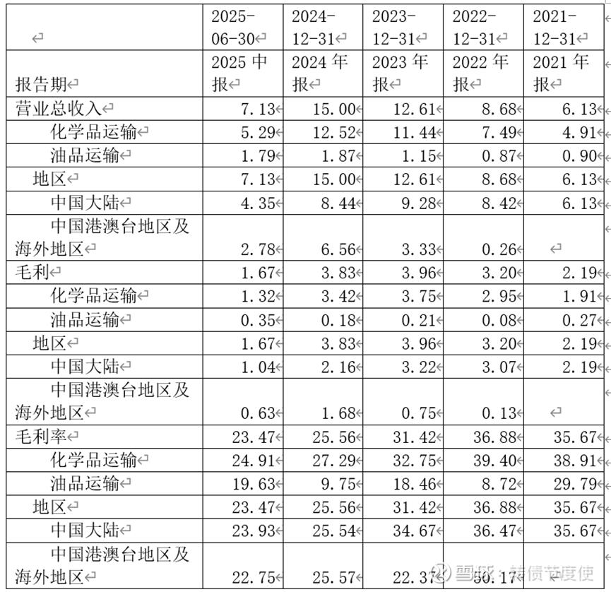 公司营业收入中以化学品运输为主,2021年到2024年收入从6亿元达到了15亿元,2025年6月有7亿元,收入增长幅度看着不错。毛利方面,2021到2025年1-6月毛利从2亿元上升到了4亿元,2025年1-6月达到了1.67亿元。但是毛利率却快速下滑从35%滑到23%。说明这个行业也是不好干的。