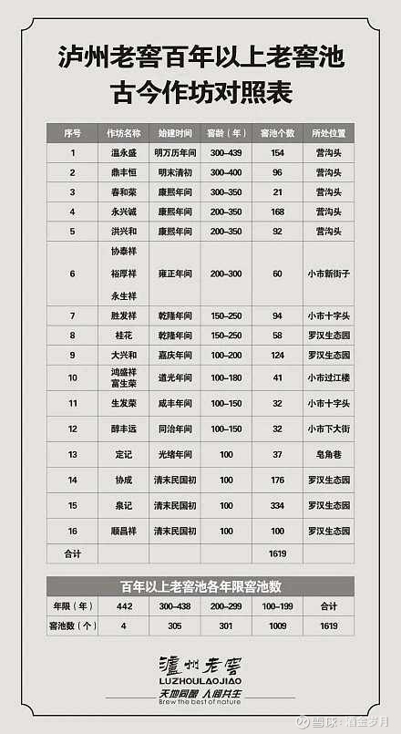 这张图也就老窖敢公布,其他浓香白酒没有一家敢发布的,都是说总产能的优酒率,说自己有多少口窖池等等。老窖在90年代基本没跟上挖新窖池东风,所以10086口窖池都是老窖池,除了这1619口公布的,其余的都在30-90年不等,随着时间延长,80-90年的老窖池也达到百年标准了。