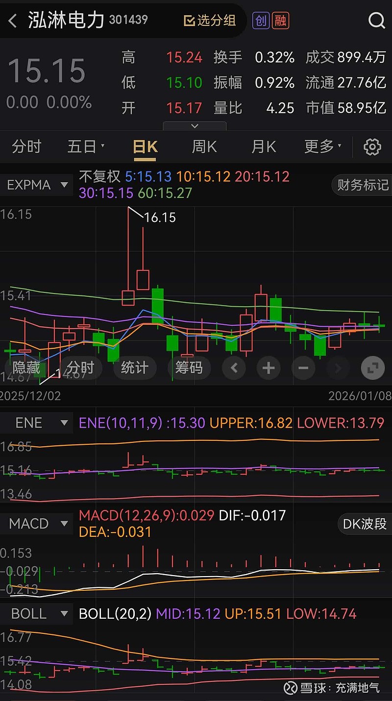 泓淋电力BOLL中轨企稳,ENE轨道内震荡,关注量能变化。