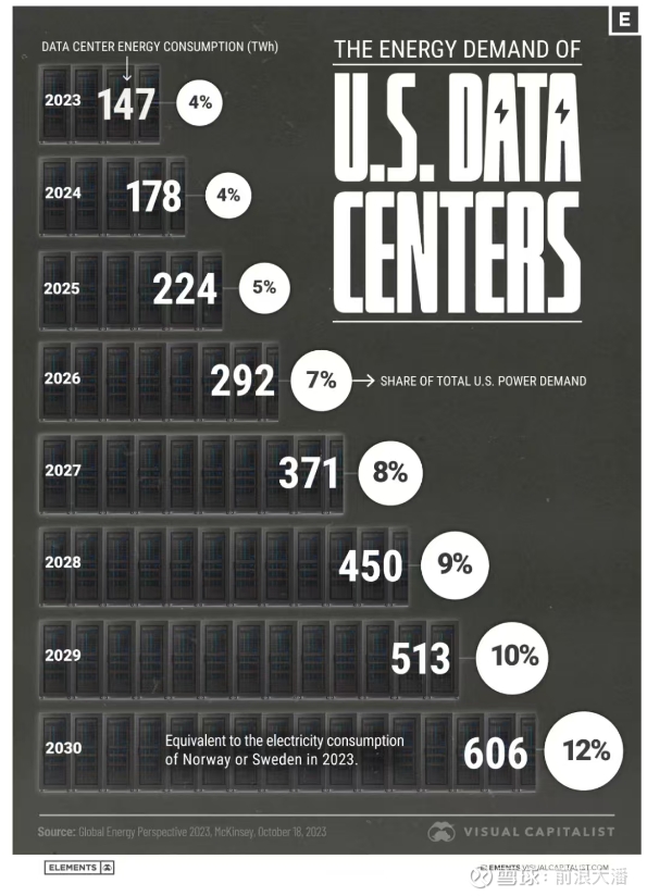 麦肯锡预计2025年数据中心电耗224TWH,约占美国电力总消耗的5%。到2030年数据中心电耗或升至606TWH,占美国电力总消耗比例升至12%。麦肯锡同时预测2025至2028年美国AI数据中心新增用电需求将达65GW,2025-2028年美国用电缺口将高达45GW,2029年用电缺口将进一步扩大至68GW。