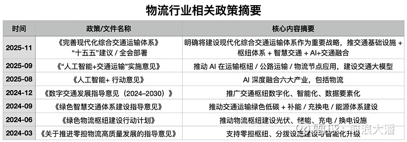 尤其是2025年的《人工智能+交通运输实施意见》,明确给出了“交通大模型”“典型场景AI化”“无人装备推广”“智能枢纽建设”等方向。政策的核心逻辑很清晰:物流是AI最容易产生规模效应的领域,也是最能带动实体经济效率提升的领域,因此整个行业将迎来政策托底与资金倾斜。