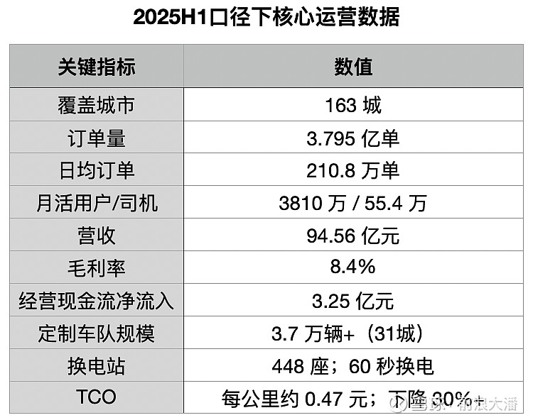 曹操2025H1的现实状态是高增长、毛利率改善,且经营现金流转正/显著增强。特别是在出行这种薄利行业里,曹操已经出现现金流改善这种经营质量变化的信号。完全不考虑Robotaxi业务,目前市场给的折扣也偏重。