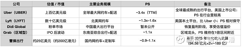 仅按出行业务年化收入计,当前市值约200亿港元(合计约180-190亿元)。拿2025H1营收94.56亿元,简单年化约189.12亿元,PS约在0.9–1.1倍附近。