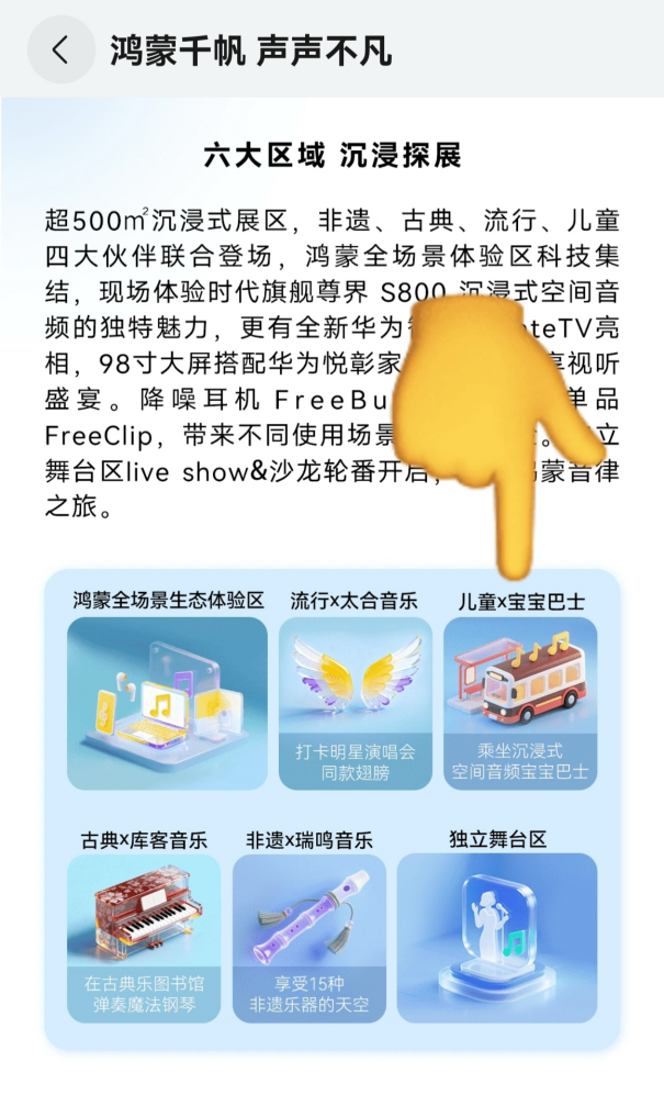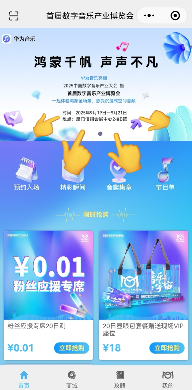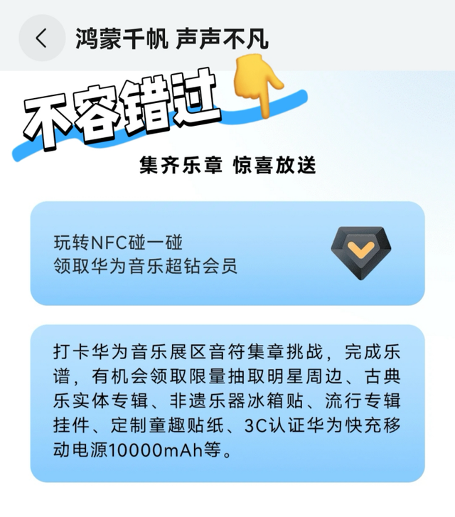 免费领票的指南我也给大家安排上了,即日起前往华为音乐找到首页活动banner,点击进入根据指引免费领取电子门票(数量有限,先到先得)。如果你刚好周末还没安排?不如约上朋友,来一场童趣与科技交织的奇妙音乐之旅!现场碰一碰就能领取华为音乐超钻会员,获得免费听海量曲库的机会;打卡华为音乐展区音符集章挑战,完成乐谱,有机会领取限量抽取明星周边、古典乐实体专辑、非遗乐器冰箱贴、流行专辑挂件、定制童趣贴纸、经过3C认证的华为快充移动电源10000mAh等。这波羊毛真的很给力!