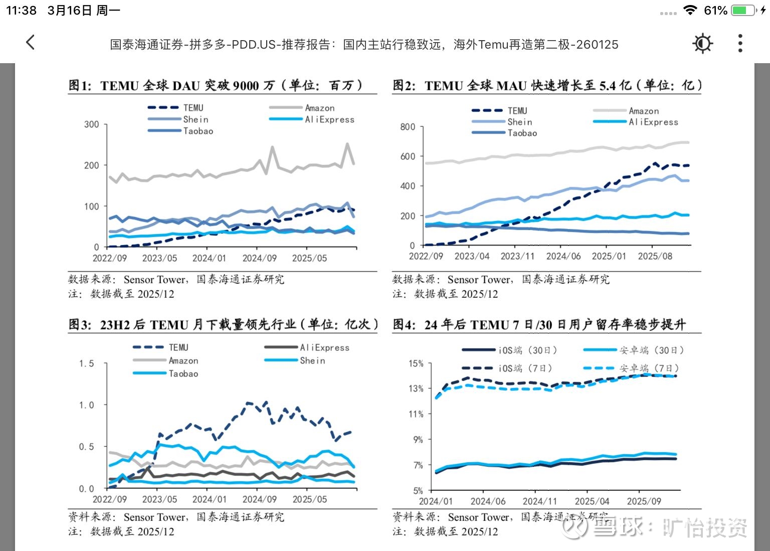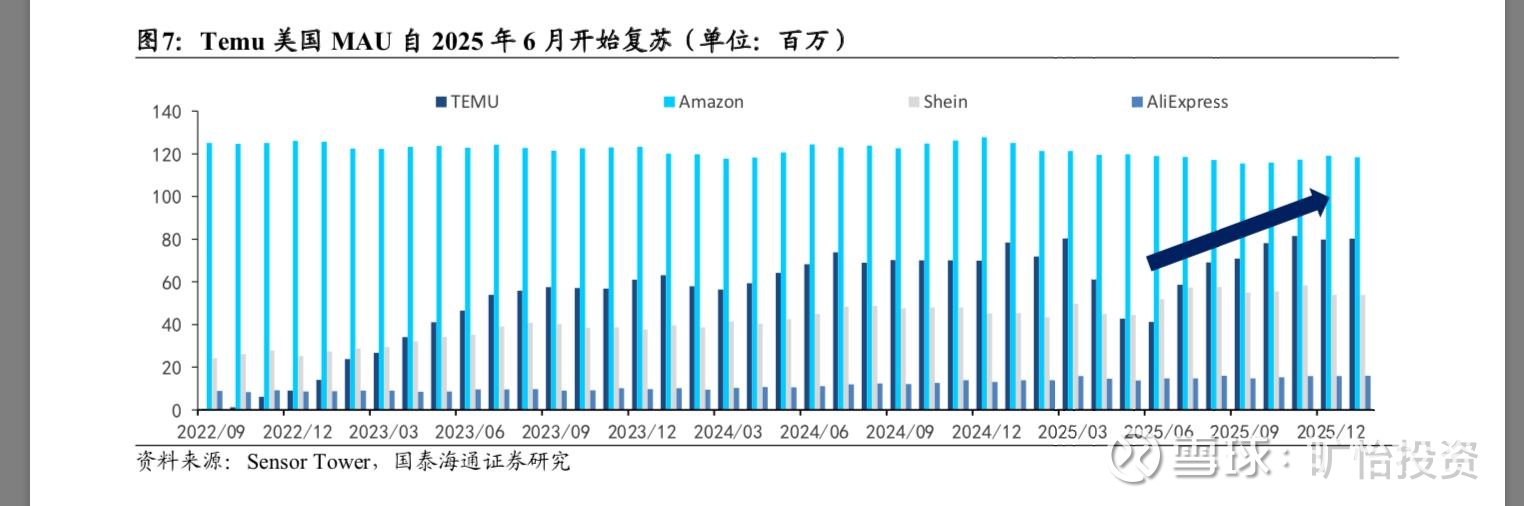 2)拼多多主站的MAU是达到7亿+增长趋缓之后开始做到季度盈利的。目前TEMU自2023年以来,MAU 每年增长在1.8亿,2023年底MAU为1.8亿,2024年底为3.6亿,2025年底MAU在5.4亿,2026年中期及年底可以看看增速是否放缓。