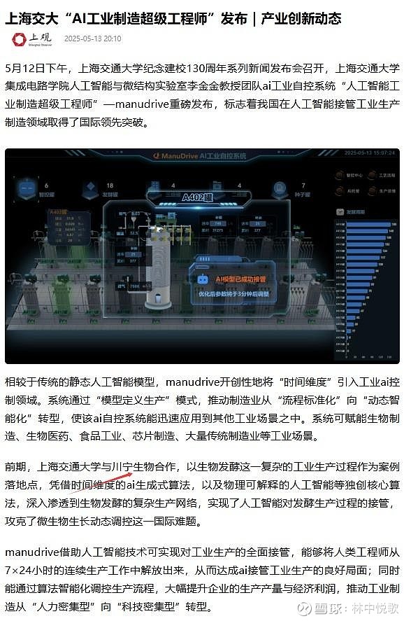 $川宁生物(SZ301301)$ 川宁生物和上海交大合作开发了“人工智能工业制造超级工程师”—manudrive。manudrive借助人工智能技术可实现对工业生产的全面接管,能够将人类工程师从7×24小时的连续生产工作中解放出来,从而达成ai接管工业生产的良好局面;同时能通过算法智能化调控生产流程,大幅提升企业的生产产量与经济利润,推动工业制造从“人力密集型”向“科技密集型”转型。