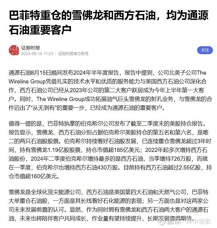 $通源石油(SZ300164)$ 通源石油北美业务占比78%,第一和第二大客户分别是雪佛龙和西方石油。美国目前授权雪佛龙在委内瑞拉经营石油业务。巴菲特的第5、6持仓股就是雪佛龙和西方石油,巴菲特22年分批买入后估计浮亏都在10%以上。