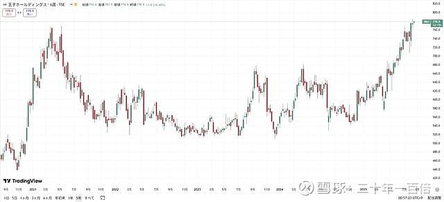 王子ホールディングス(旧・王子製紙)の株価は現在、4年ぶりの高値圏まで上昇しています。かつて2020年11月には米ファイザーと米モデルナが相次いで新型コロナウイルスのワクチンを開発し、株式市場全体は強気相場入りしました。日経平均株価は同年10月末から12月末まで19.4%上昇します。 この状況から当時、景気敏感株の王子ホールディングスにも買いが集まりました。さらに、パルプ市況も20年後半から高騰したこと、同年12月に株主優待の新設を発表したことも影響し、株価は21年5月の高値769円まで上昇します。その後は510円台まで反落し、散発的な上昇は見られたものの、おおむね停滞が続きます。 足元の本格的な反発は24年12月に始まります。大型の自社株買い(自己株式を除く発行済み株式数の最大10.1%)を公表すると、株価は前日比プラス11.2%と急騰しました。以降も買いが続き、現在は4年前の高値を上回る770円台で取引されています。