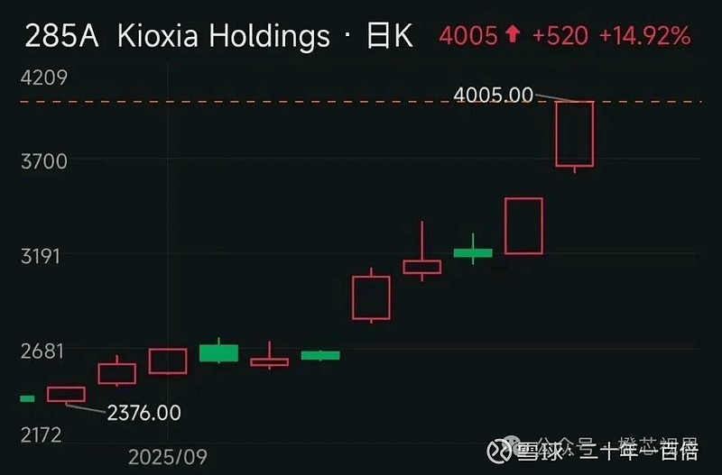 日本存储巨头铠侠(Kioxia)——也就是曾经大名鼎鼎的东芝存储器部门——其股价今天单日涨幅达到了惊人的14.92%。短短数日内,股价更是从2376日元飙升至4005日元,累计涨幅高达68.6%。市场普遍将此归因于其合作伙伴闪迪(SanDisk)近期提价所带来的行业景气度提升。但,这足以解释如此剧烈的涨幅吗?答案显然是否定的。要理解铠侠的真正价值,我们必须把时钟拨回到几个月前。