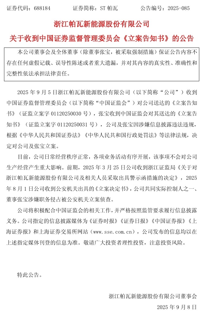 公司董事长兼总经理张宝、副总经理兼财务总监袁建军、时任董事会秘书徐琥违反了《上市公司信息披露管理办法》(证监会令第182号)第四条的规定。2025年8月4日,ST帕瓦公告披露,公司于 2025 年 8 月 1 日收到公安机关出具的《立案决定书》,公司共同实际控制人之一、董事张宝涉嫌职务侵占被公安机关立案侦查。