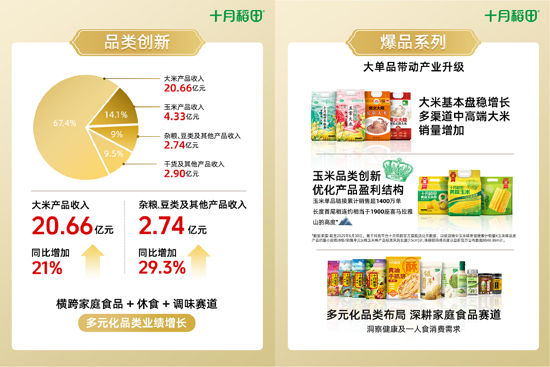 细分来看,2025年上半年大米产品收入20.66亿元,同比增长21%,仍为最大收入来源;除了聚焦高端大米业绩增长,十月稻田也发挥领先影响力,参与制定五常大米新国标,助推行业高质量发展。