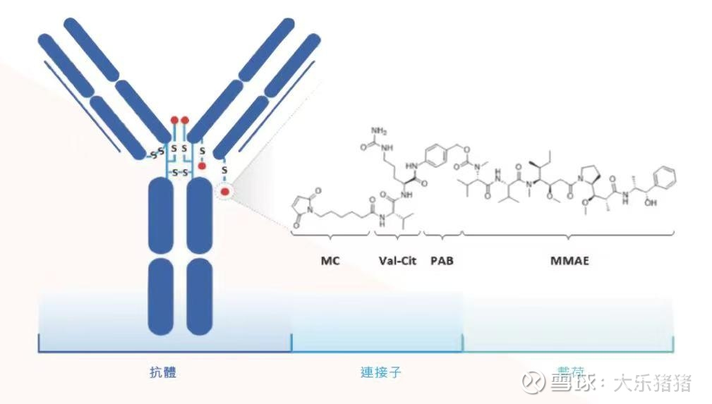 维迪西妥单抗结构。MC为maleimidocaproyl的缩写,MMAE为一甲基澳瑞他汀E的缩写,PAB为p-aminobenzyl的缩写,MC-Val-Cit-PAB为蛋白酶可剪切的ADC连接子。