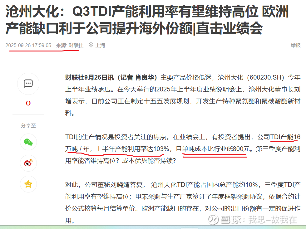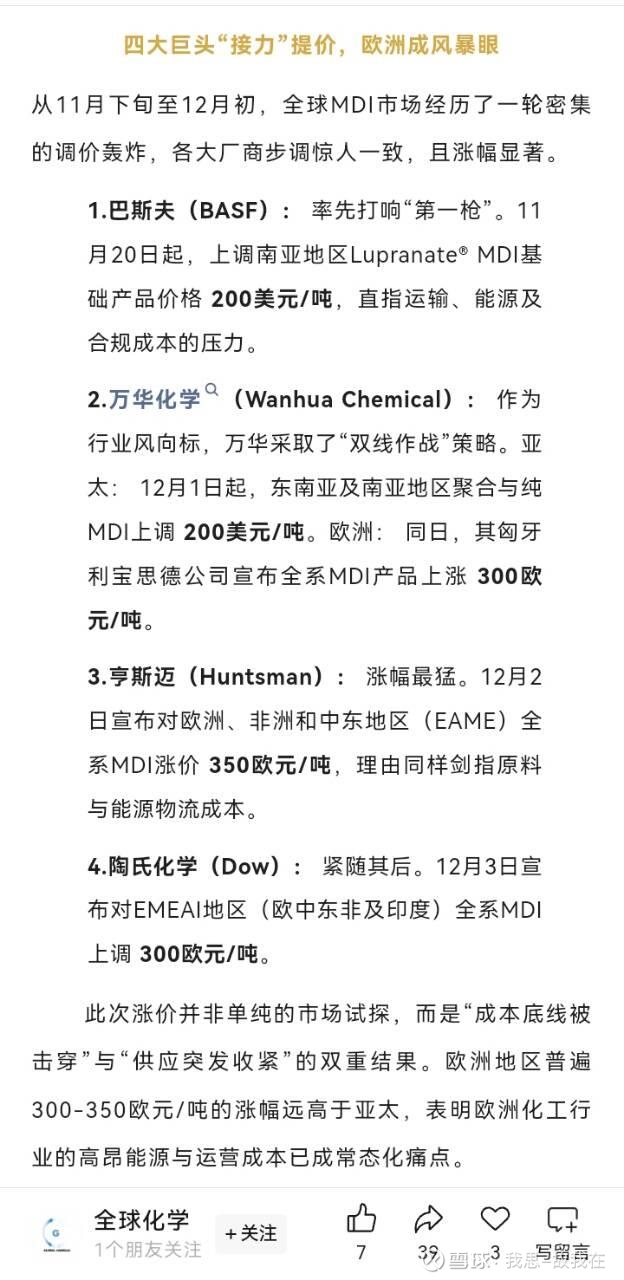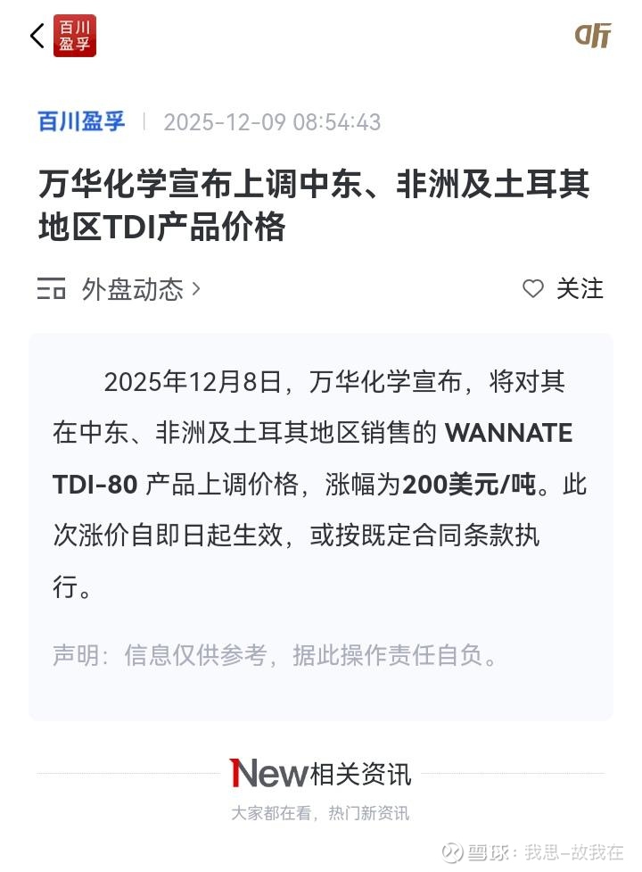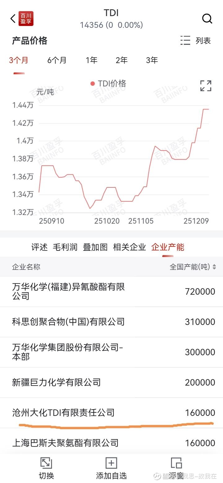 加上,今天万华化学将国外TDI价格上调200美元/吨。行业老大TDI价格都调涨200美元/吨了,沧州大化TDI价格调涨还远吗?