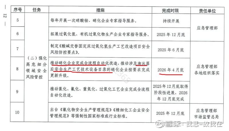 (2)2025年2月和6月,国家相继发布了相关Z策,要求有硝化反应的装置必须在2026年4月底前完成全流程自动化生产改造,否则会被永久关停。