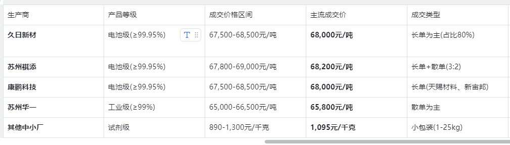 长单价格稳定性:久日新材、康鹏科技等头部企业与电解液大厂 (天赐材料、新宙邦、江苏国泰) 签订的 1-3 个月长单价格锁定在67,500-68,500 元 / 吨,较 12 月中旬无明显变动