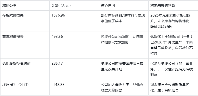 可见,减值集中于“历史库存”“过往并购商誉”“非核心参股投资”,均为一次性因素;且弘润化工(商誉减值主体)已进入项目试生产阶段,未来反而可能成为业绩增量,减值本质是“刮骨疗毒”,清理财务包袱后更利于2026年新产能释放。