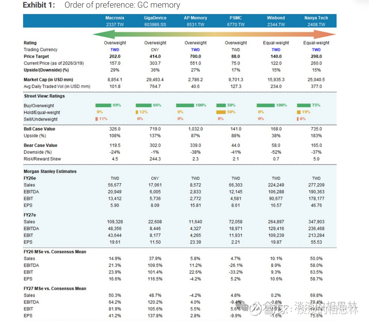 大摩上调旺宏评级,下调了大概10%的南亚科和华邦电,维持兆易创新评级,主要是业界传言大陆头部DRAM厂商可能会向其兄弟增加一部分DDR4产能供应(除了MS,从上下游都有传言),由于其规模效应,对华邦电和南亚科两个台厂潜在市场会造成压力。NOR/SLC/MLC会在一二季度加速上涨,因此上调和维持另外两个。