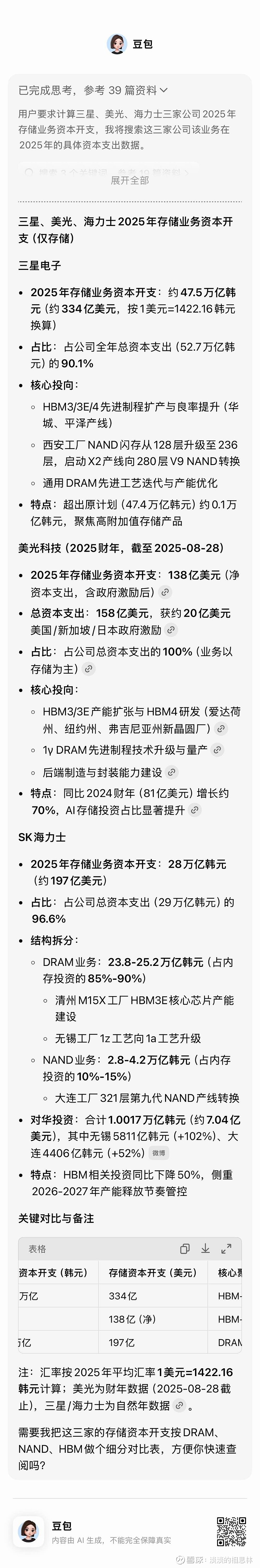 这是三星,海力士和美光25年报的资本开支计划,对应的就是26年的产能,压根没人盖过NAND新线,dram也没啥新增,都是工艺改进….望周知,所以今年压根不可能有十万八万那种新产能释放这么多想要筹码的,天天瞎编啊