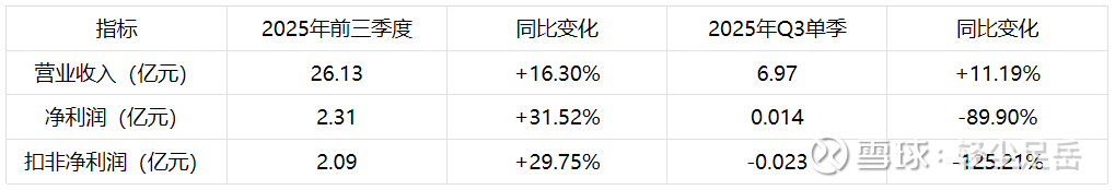前三季度整体表现强劲,营业收入26.13亿元,同比增长16.30%;净利润2.31亿元,同比增长31.52%。但第三季度单季出现明显波动,净利润仅143万元,同比下降89.90%,扣非净利润为-230万元,由盈转亏。