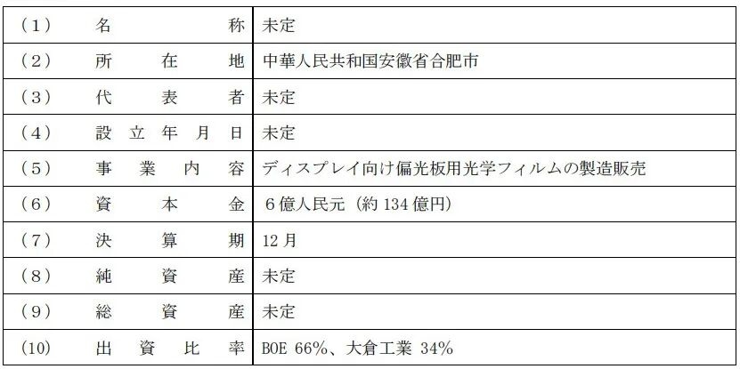 3月24日,日本大仓工业株式会社(下文简称“大仓工业”)宣布,公司与京东方旗下的北京京东方材料科技有限公司签订合同,决定在中国安徽省合肥市设立合资公司。根据公告,合资公司注册资本为6亿元人民币,其中京东方出资66%,大仓工业出资34%,主要从事显示器用偏光板光学薄膜的制造销售。